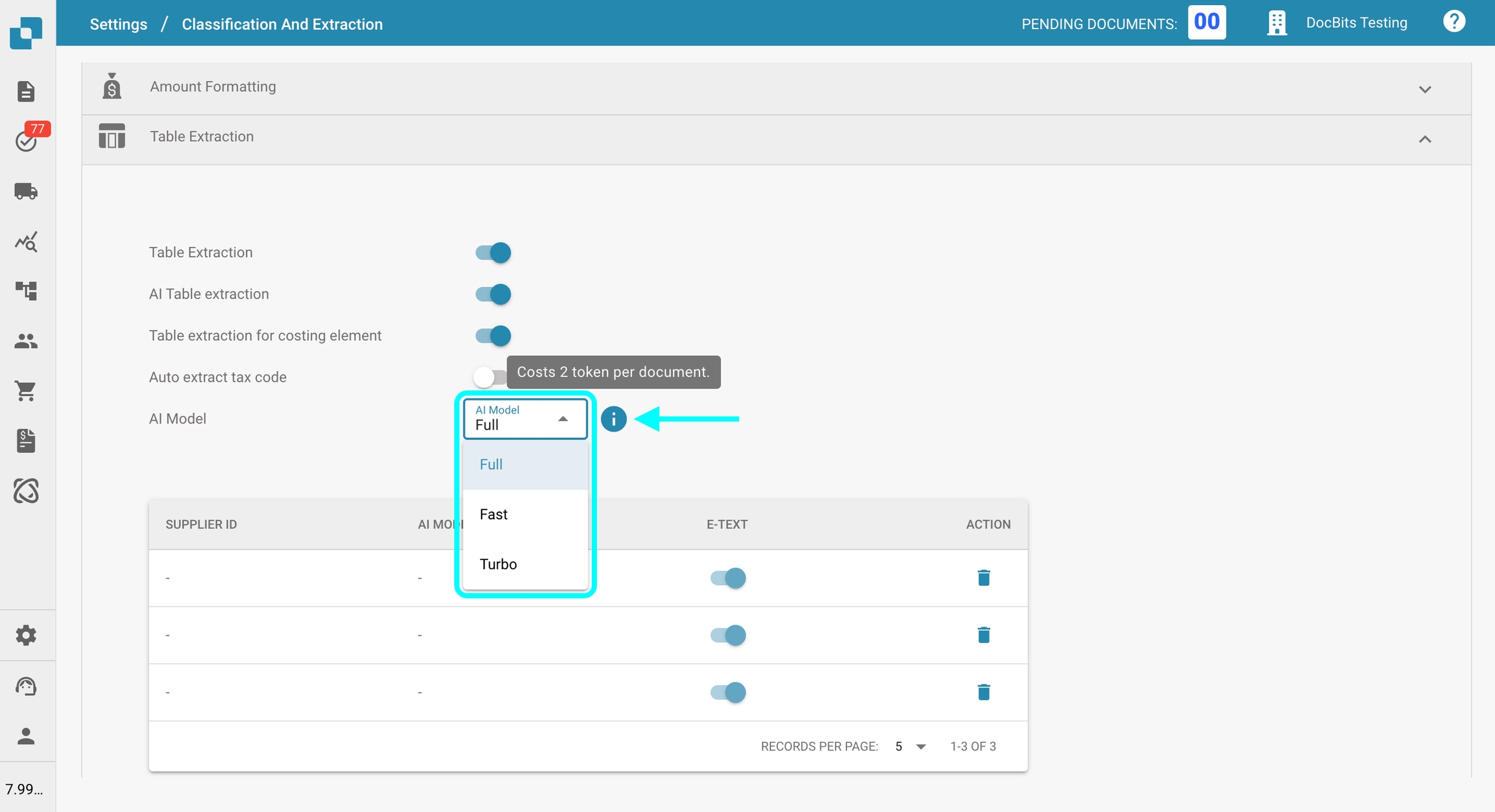 Ustawienie Model sztucznej inteligencji pozwala zdefiniować, który model AI jest używany domyślnie do ekstrakcji pól i ekstrakcji tabeli podczas przetwarzania dokumentów. W tej sekcji możesz przejrzeć koszt tokenów dla każdego modelu oraz sprawdzić, który model jest obecnie przypisany do każdego dostawcy.