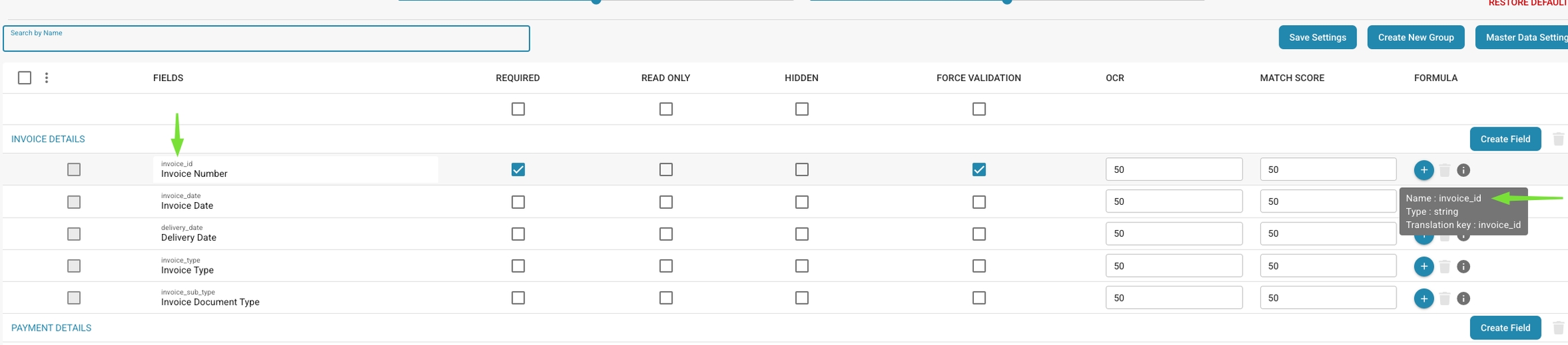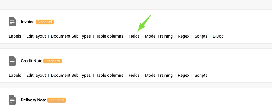 Lewa strona reprezentuje DocBits field ID, które można znaleźć w Ustawienia → Ustawienia globalne → Typy dokumentów → Faktura → Pola.