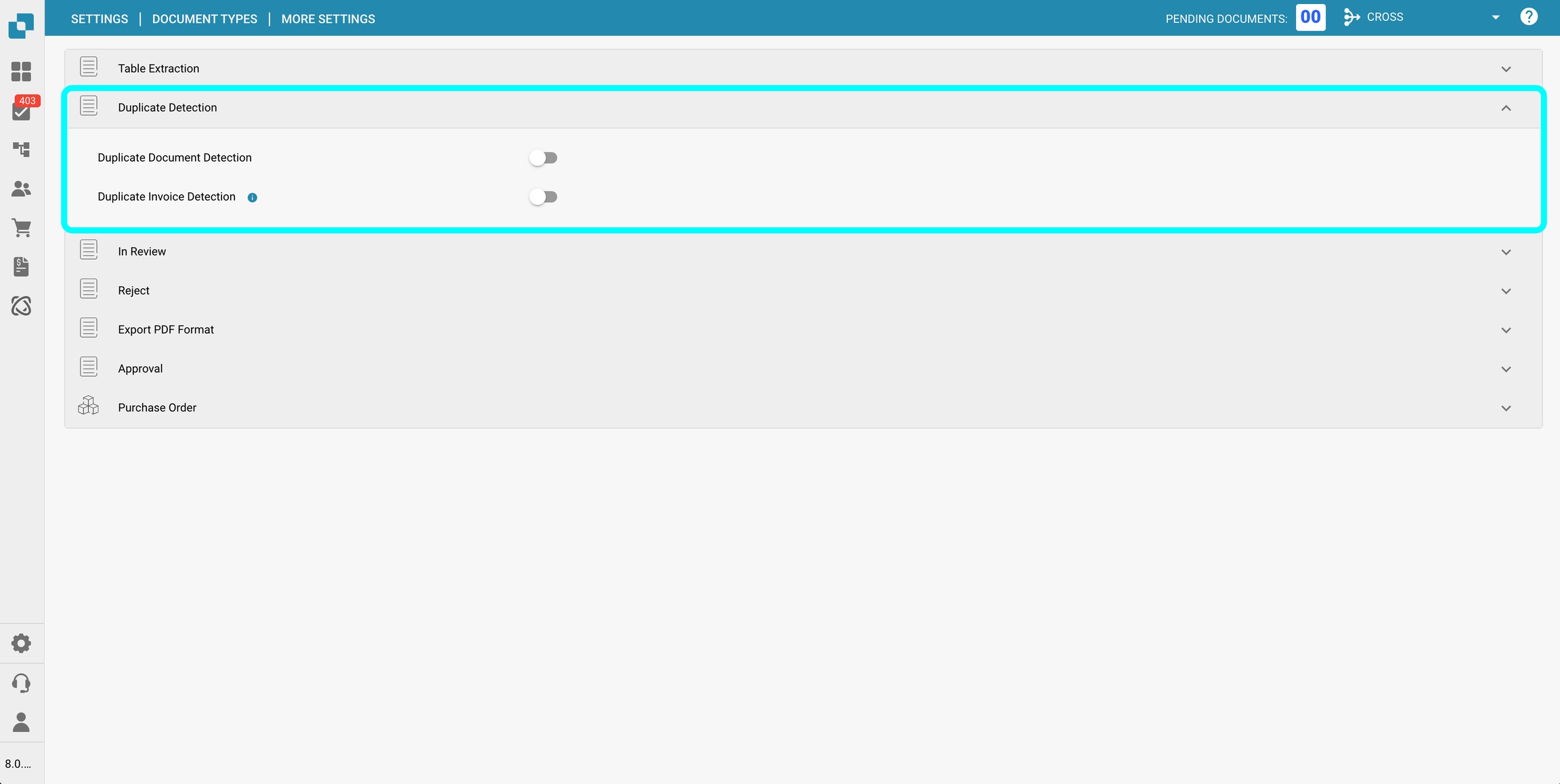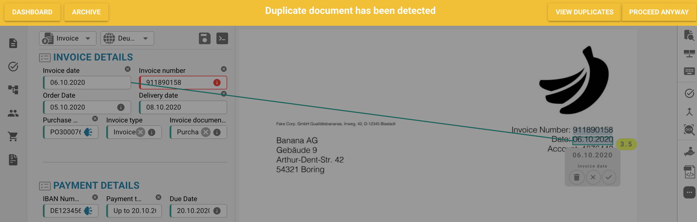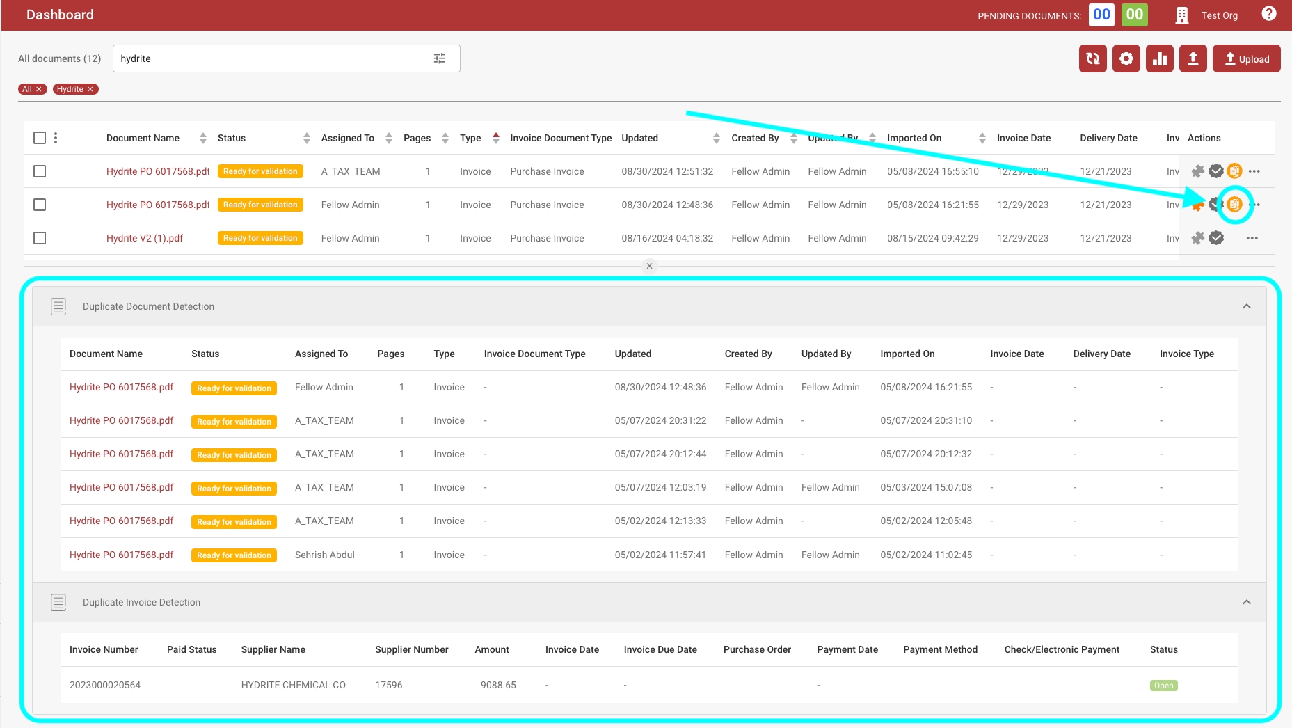 Wykrywanie duplikatów faktur (Dostępne tylko dla typu dokumentu Faktura): Ta funkcja wymaga synchronizacji faktur dostawców z Infor do DocBits. Porównuje numery faktur w panelu DocBits z tymi w Infor. Jeśli ten sam numer faktury pojawi się więcej niż raz, zostanie oznaczony jako duplikat.
