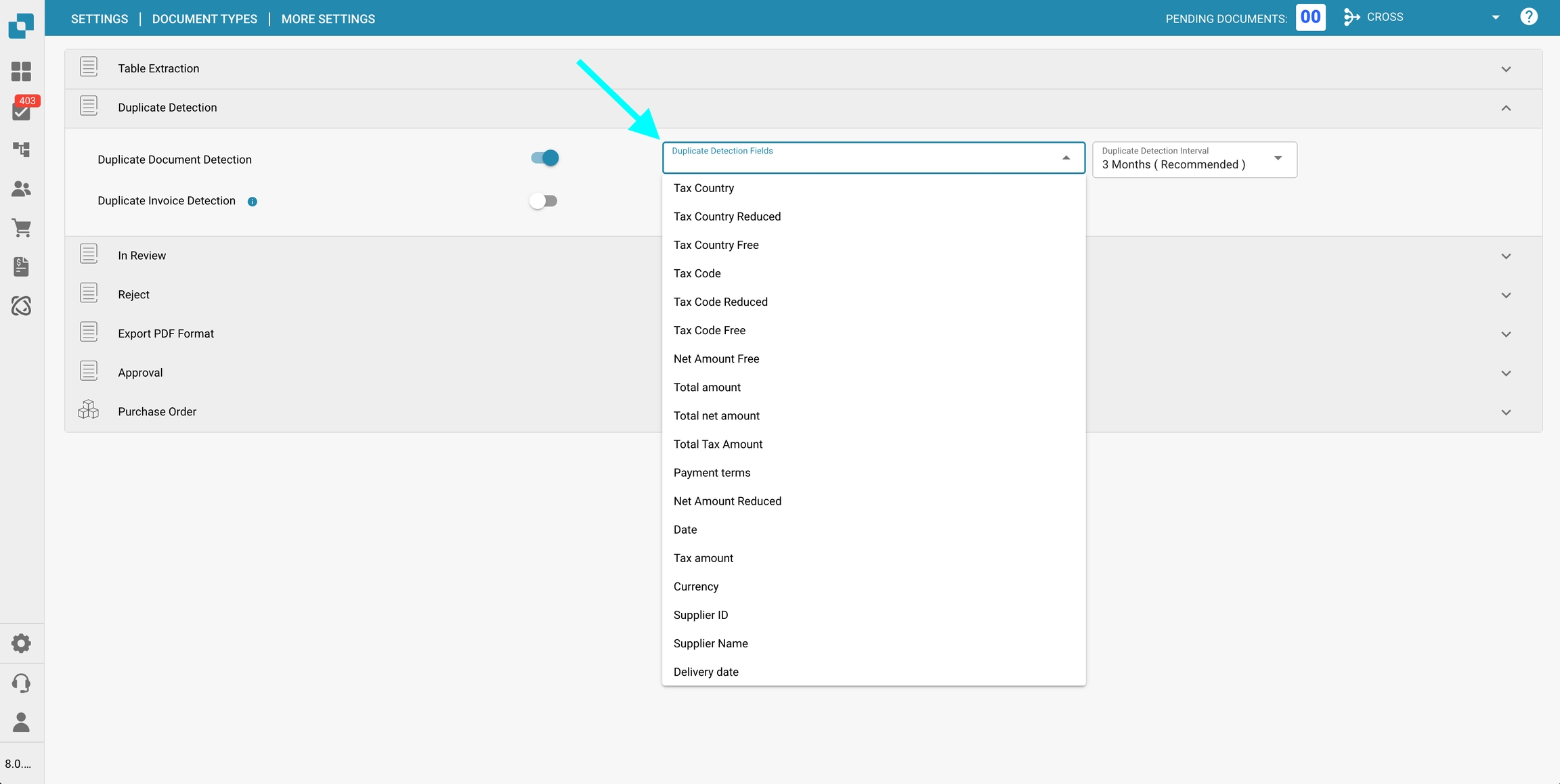 Pola wykrywania duplikatów Wybierz pola, które powinny być używane do identyfikacji duplikatów (np. Identyfikator dostawcy, Data, Numer faktury itp.). Dokumenty pasujące do tych pól będą oznaczane jako duplikaty.