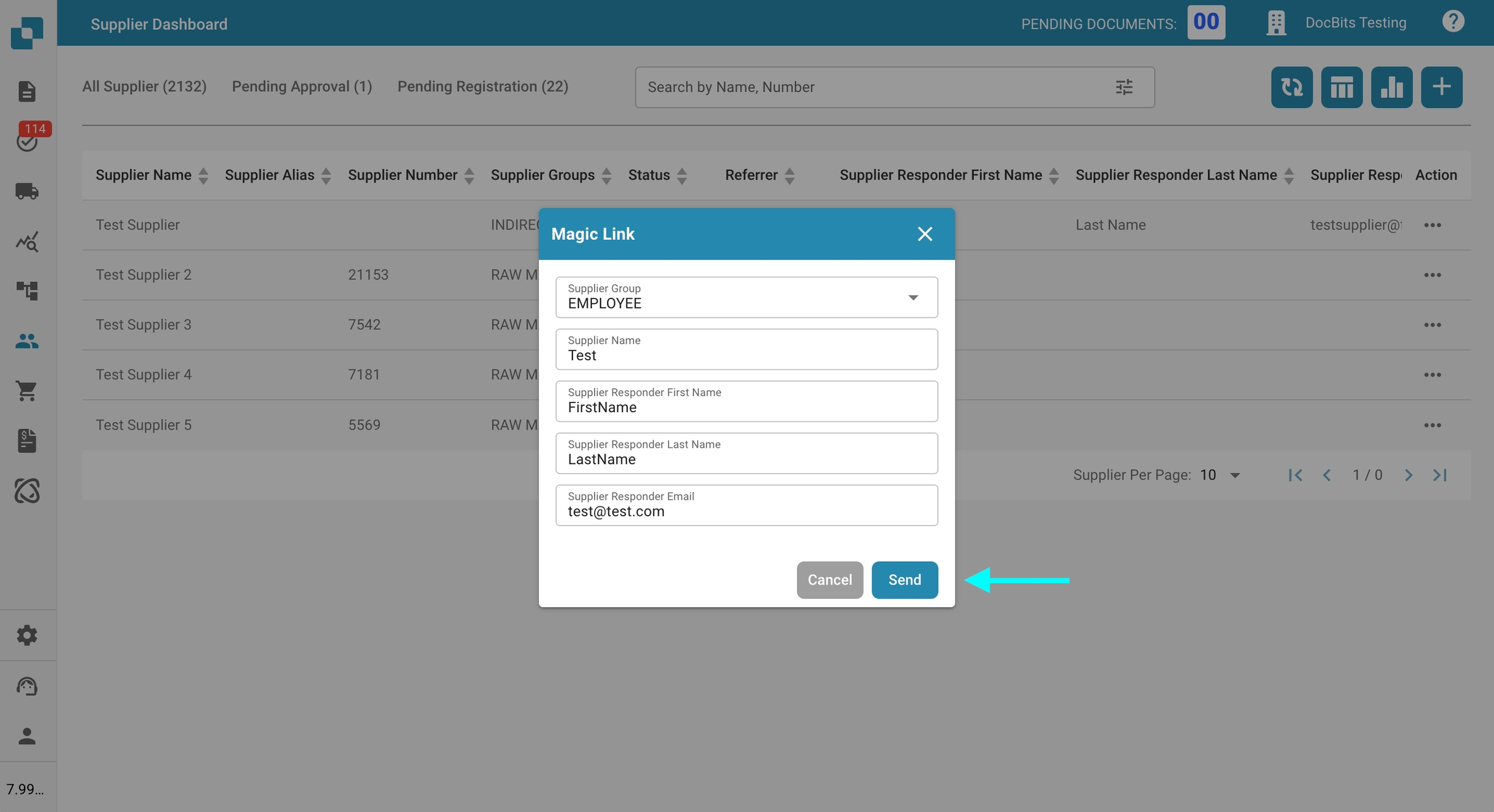 Kliknij Wysłać, aby wysłać link rejestracyjny.