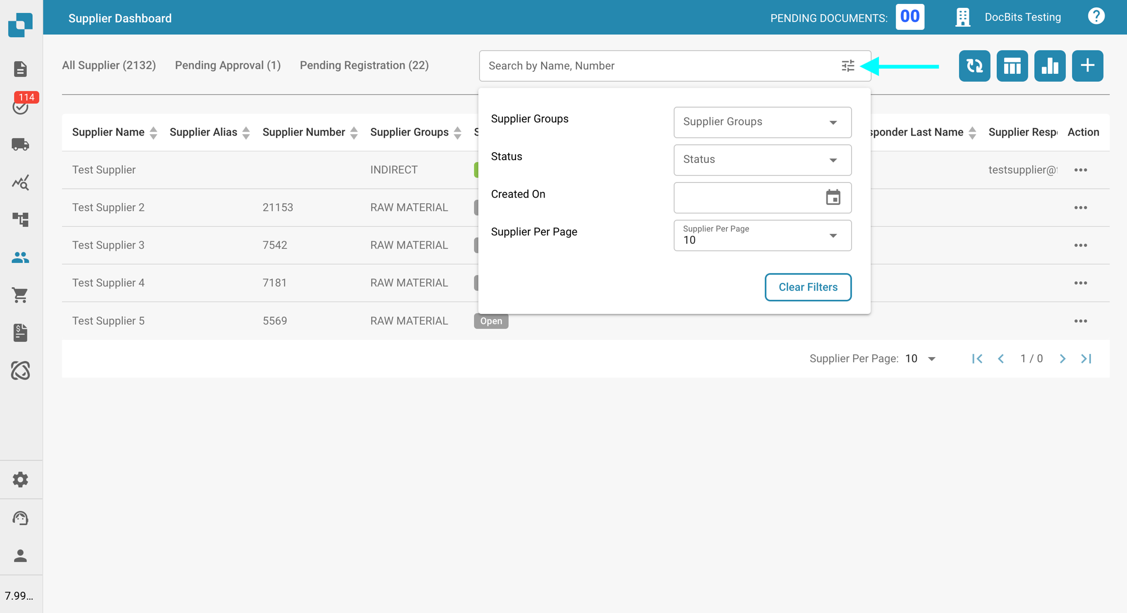 Możesz wyszukiwać dostawców według Nazwy lub Numeru, lub użyć zaawansowanych filtrów, aby zawęzić wyniki według: