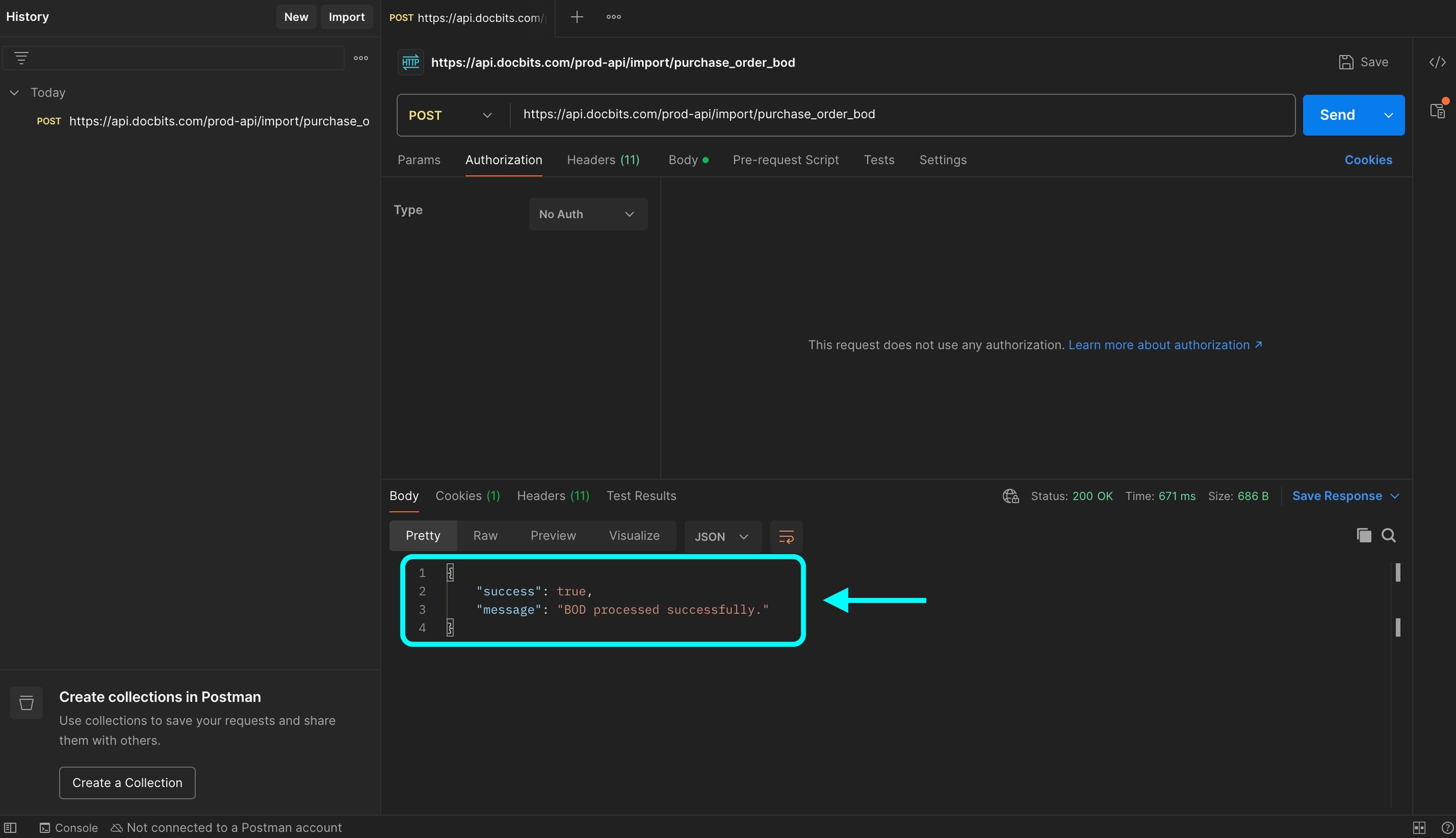 Ta strona wyjaśnia, jak zweryfikować pomyślne przetwarzanie twojego BOD (Business Object Document) za pomocą Postman. Przetestujesz odpowiedni punkt końcowy API, wysyłając żądanie z plikiem mapowania BOD. Postępuj zgodnie z poniższymi krokami, aby zakończyć proces.