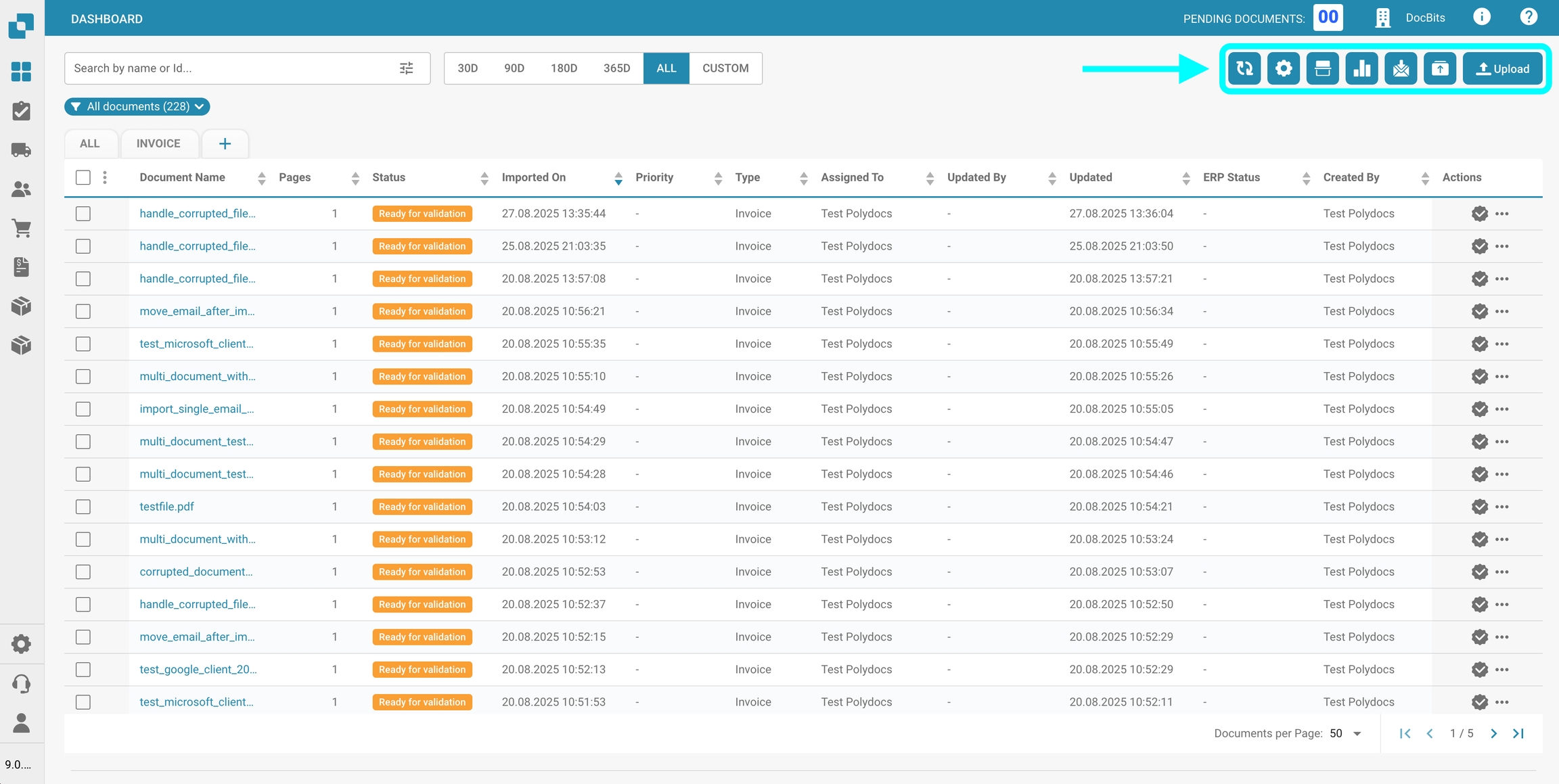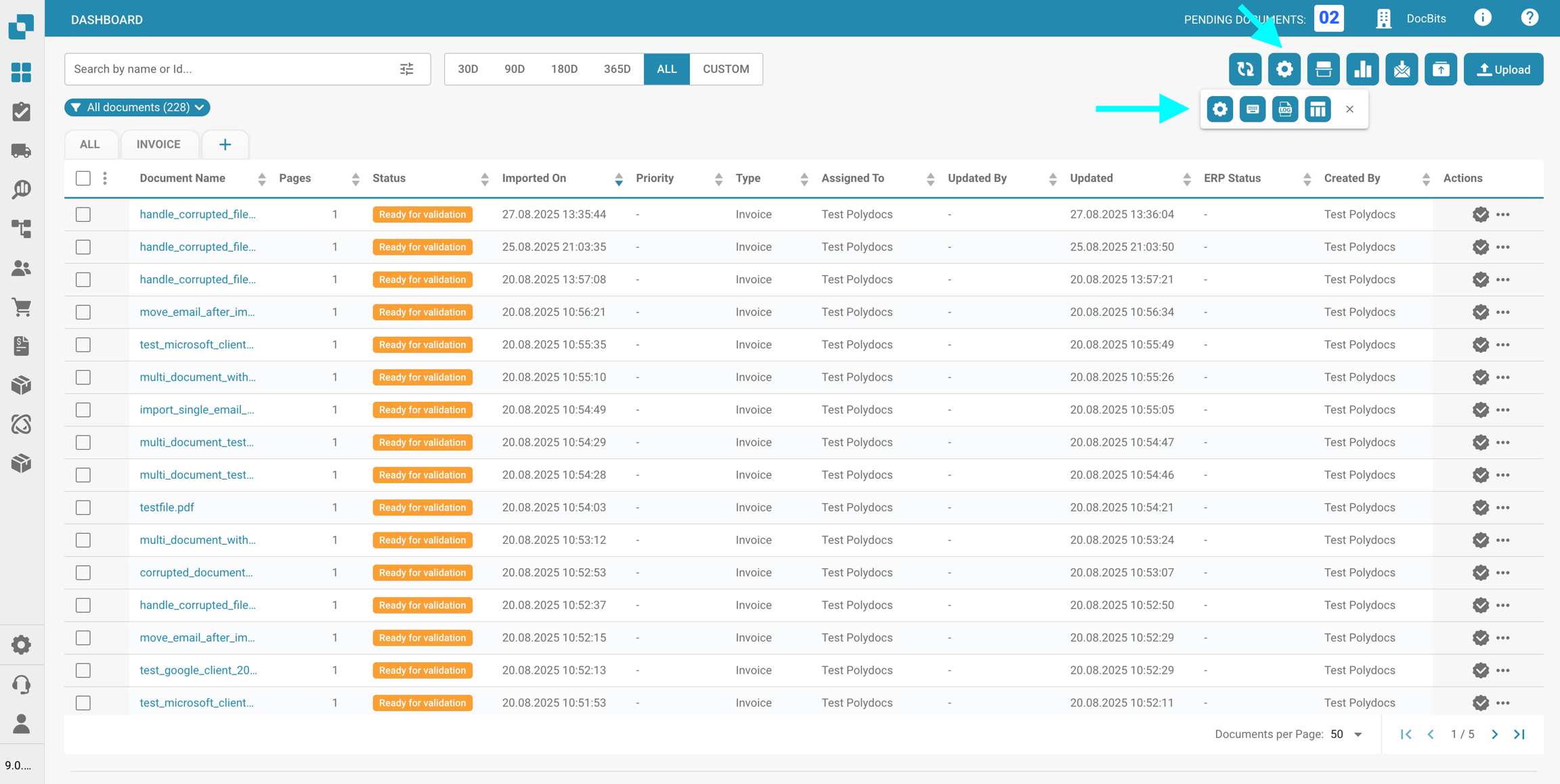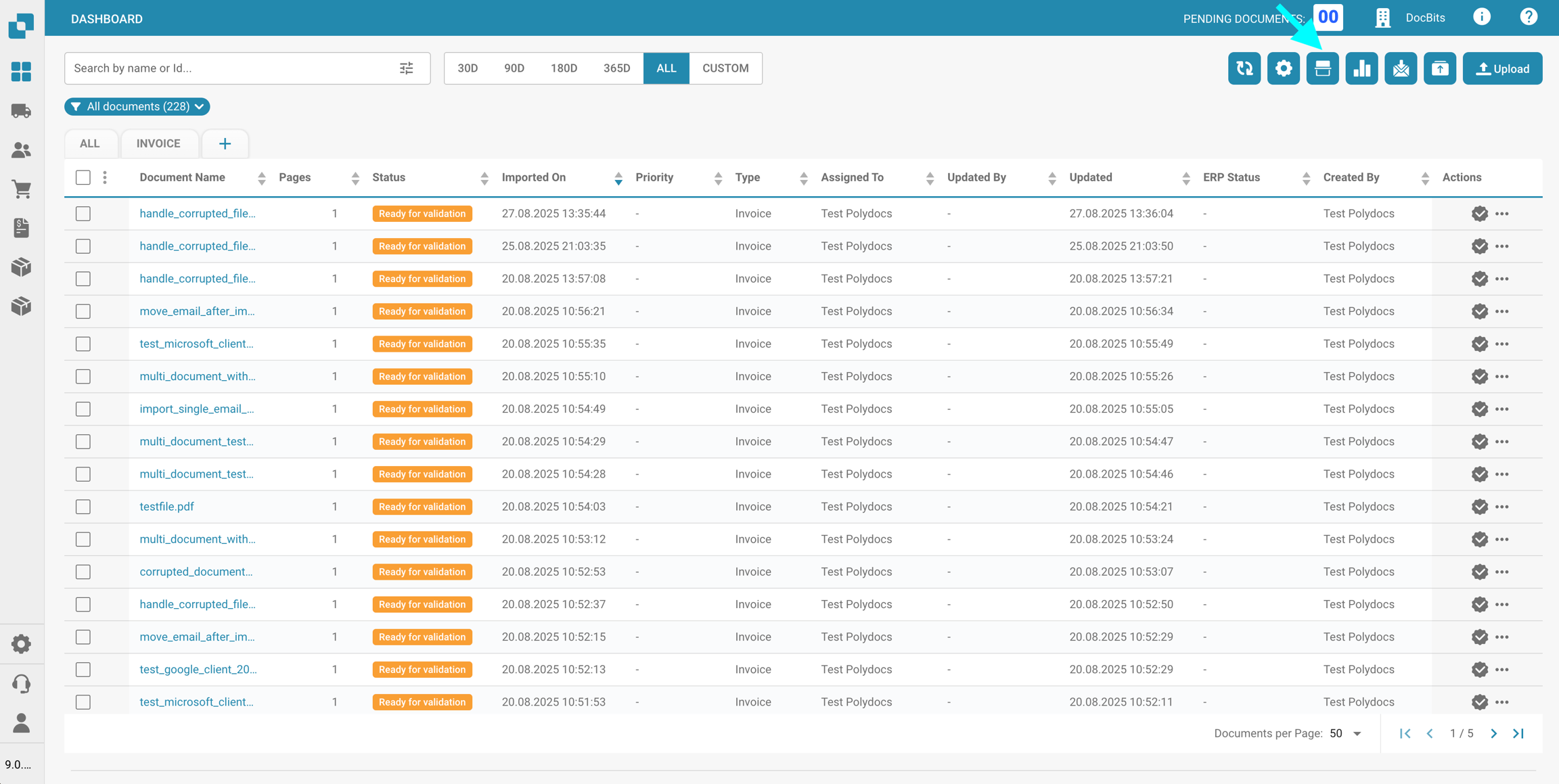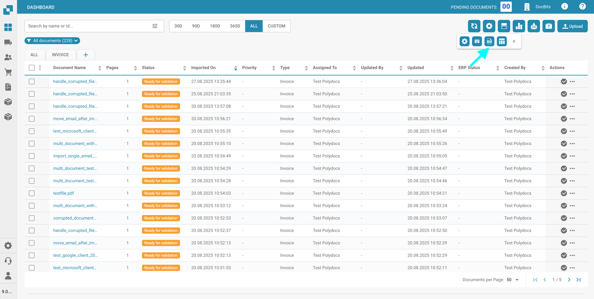 Użyj tego przycisku, aby wyeksportować wszystkie dokumenty aktualnie wyświetlane na panelu zgodnie z liczbą dokumentów pokazywanych na stronę. Możesz wyeksportować tabelę jako plik .csv lub .xlsx.