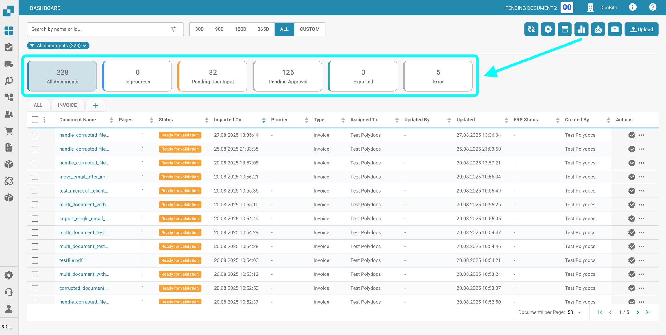 Kliknięcie tego przycisku spowoduje wyświetlenie nowego obszaru z bieżącą liczbą dokumentów w każdej kategorii.