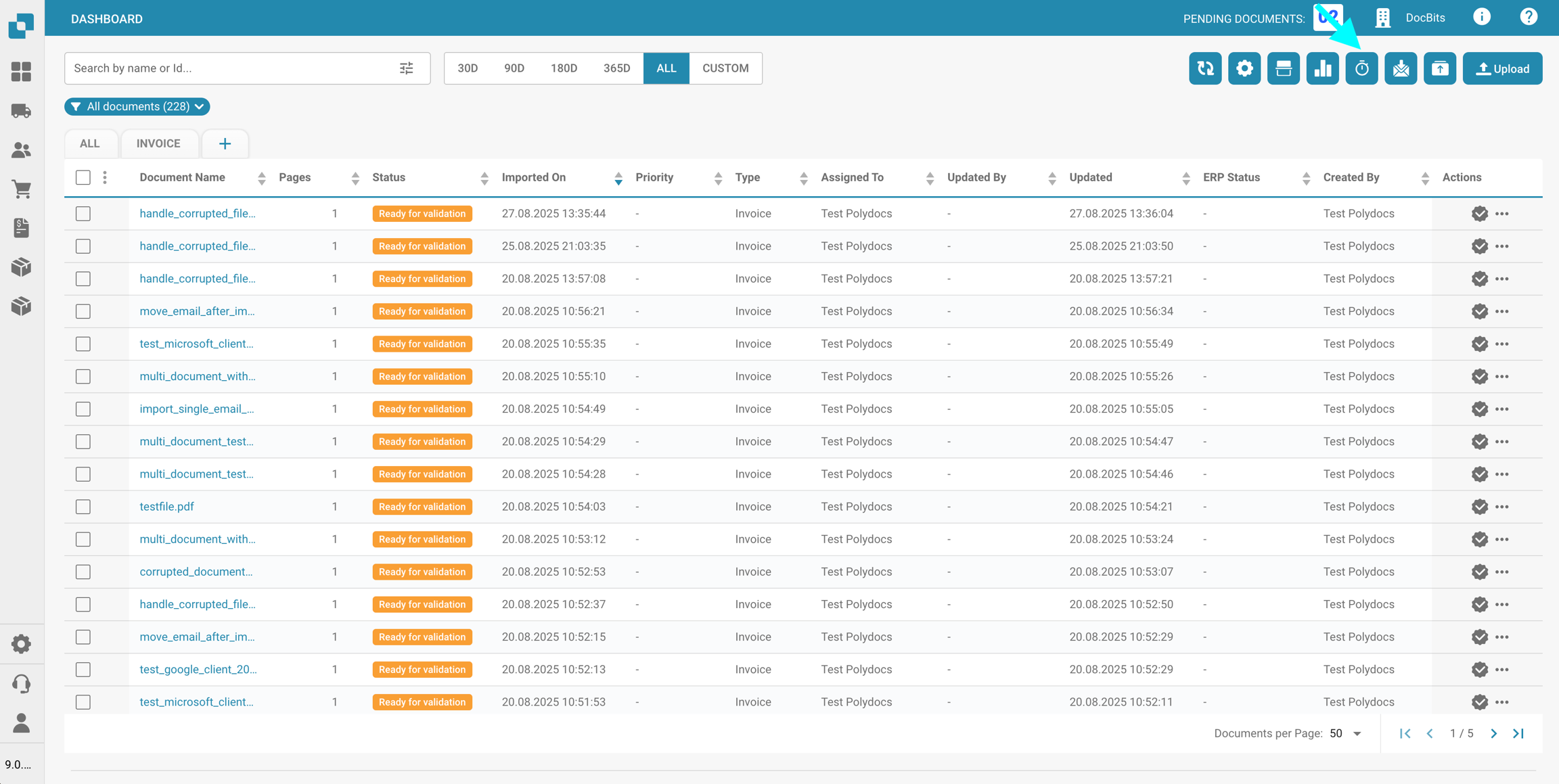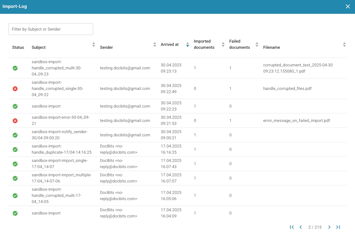 Użyj tego przycisku, aby otworzyć tabelę wyświetlającą wszystkie ostatnio zaimportowane dokumenty przez e-mail wraz z odpowiednimi informacjami dla każdego z nich.