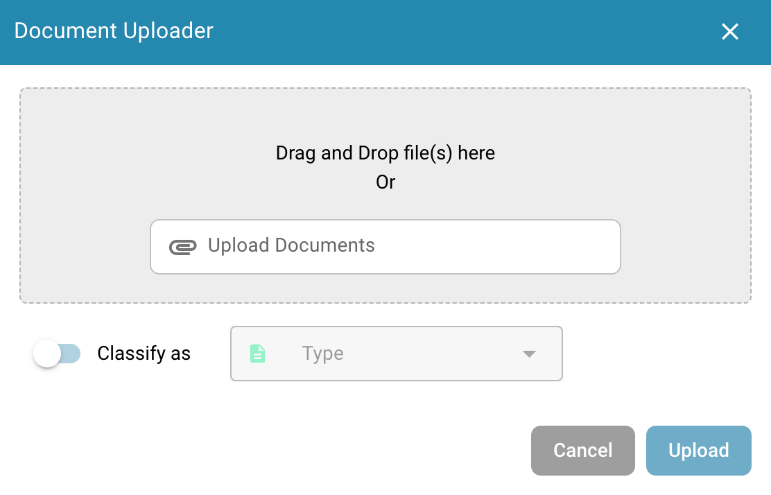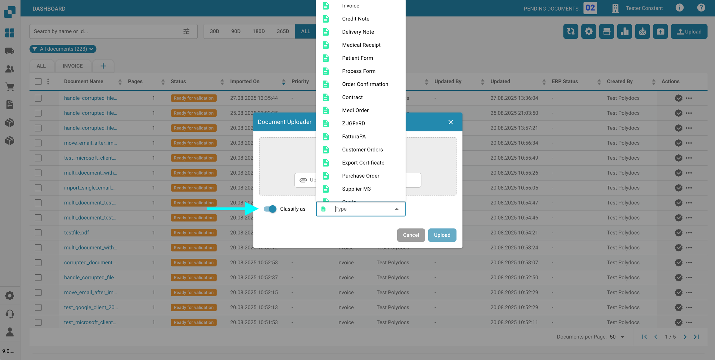 Jeśli wolisz ręcznie określić typ dokumentu zamiast pozwalać, aby DocBits sklasyfikował go automatycznie, przełącz opcję Klasyfikuj jako i wybierz odpowiedni typ dokumentu z listy.