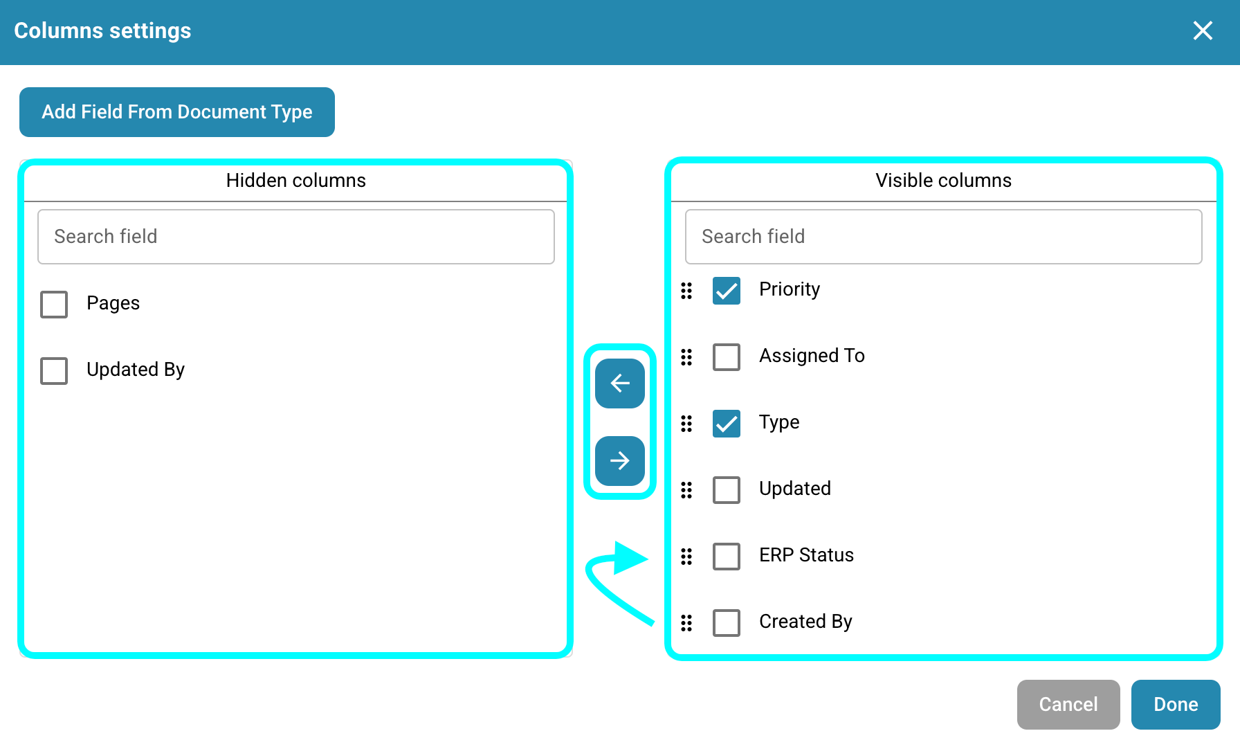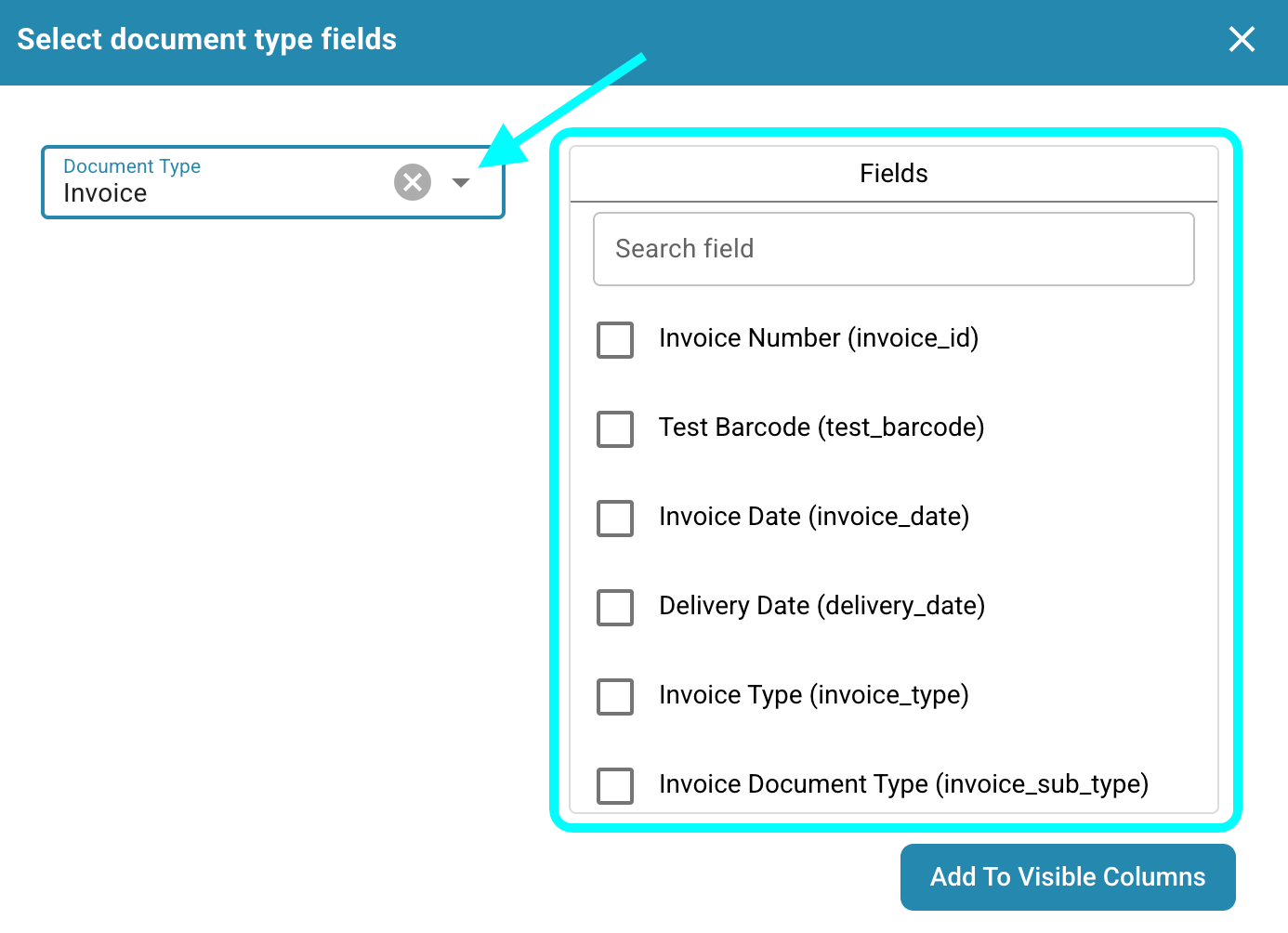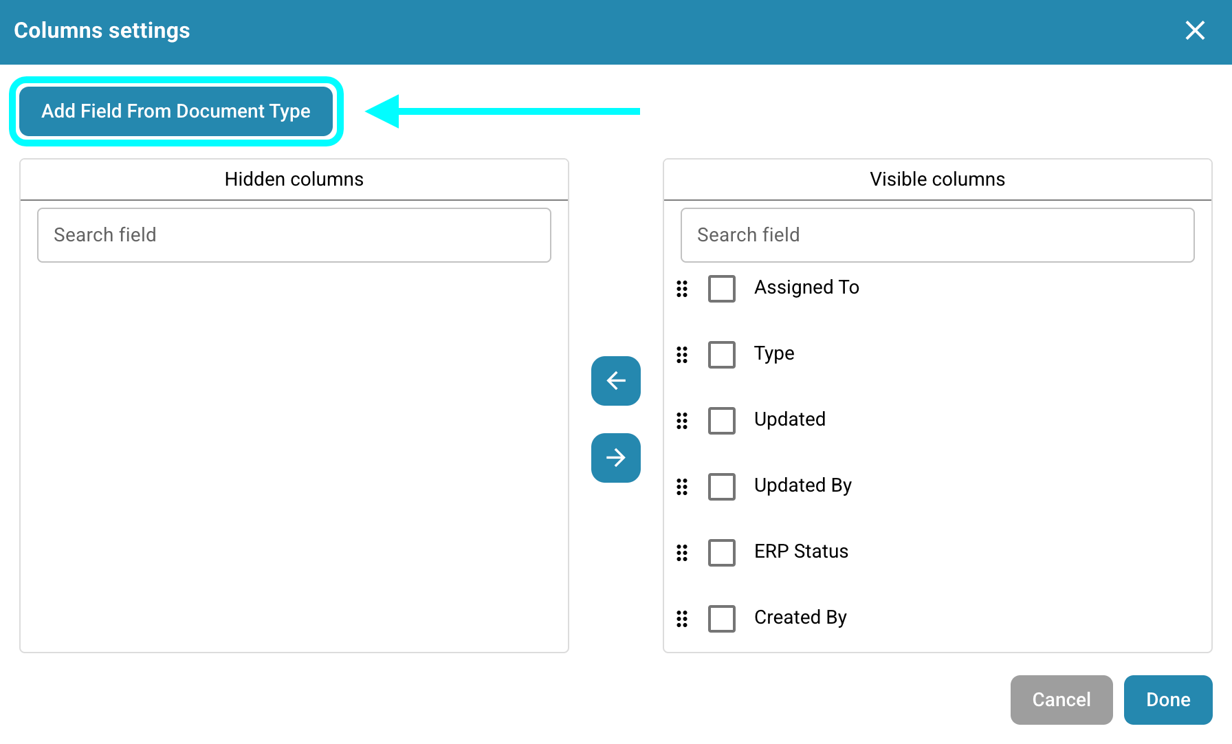 Masz również możliwość dodania dodatkowych kolumn z określonych pól wybranych typów dokumentów, aby dostosować widok panelu. Aby to zrobić, po prostu kliknij Dodaj pole z typu dokumentu.