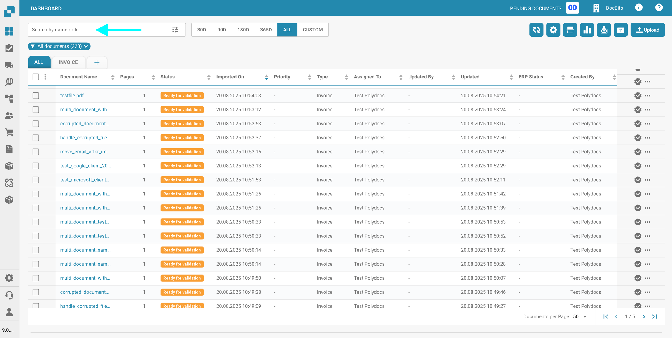 Możesz wyszukać konkretne dokumenty, wpisując nazwę dokumentu lub jego ID w pasku wyszukiwania znajdującym się u góry Panelu.