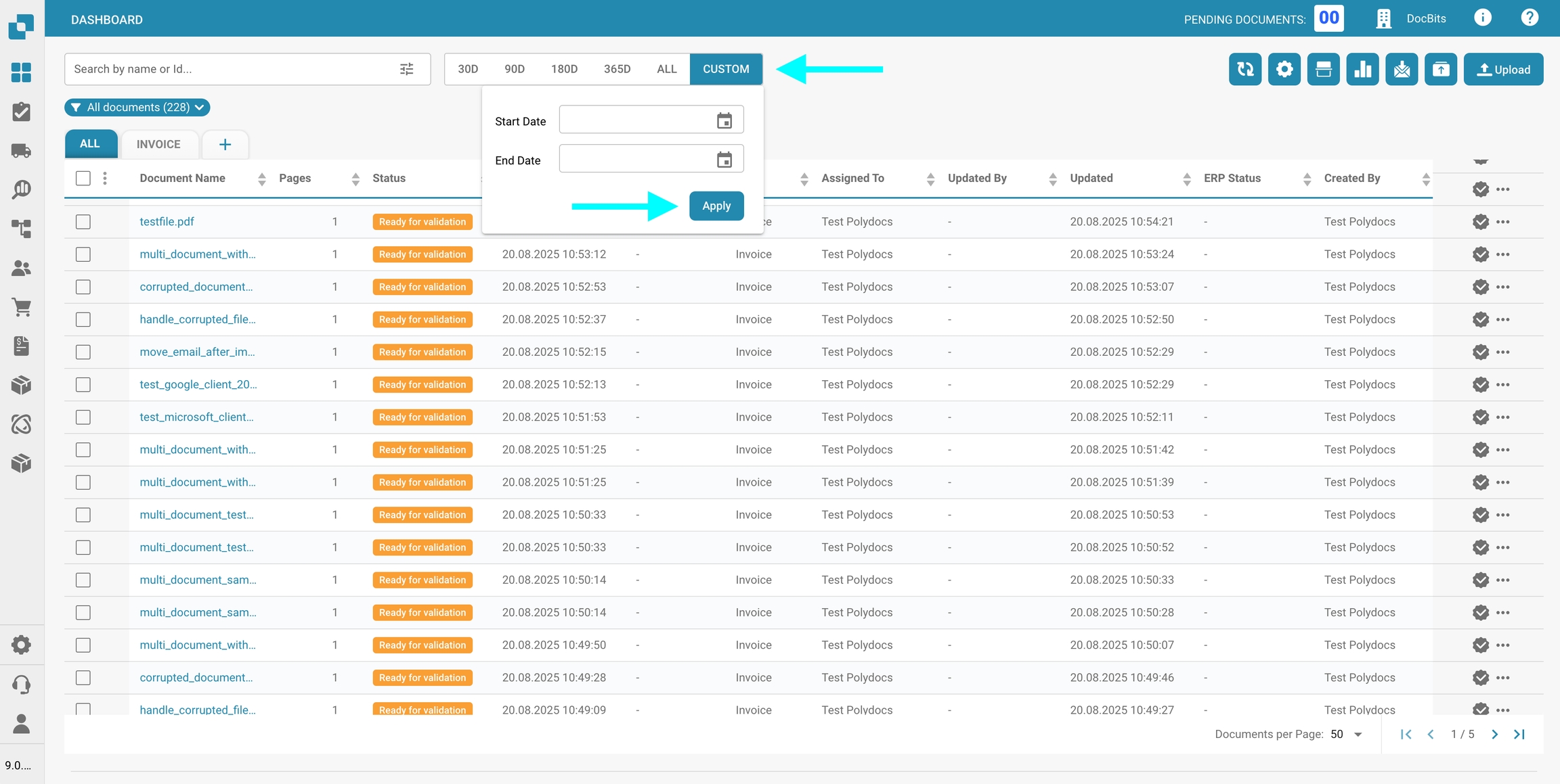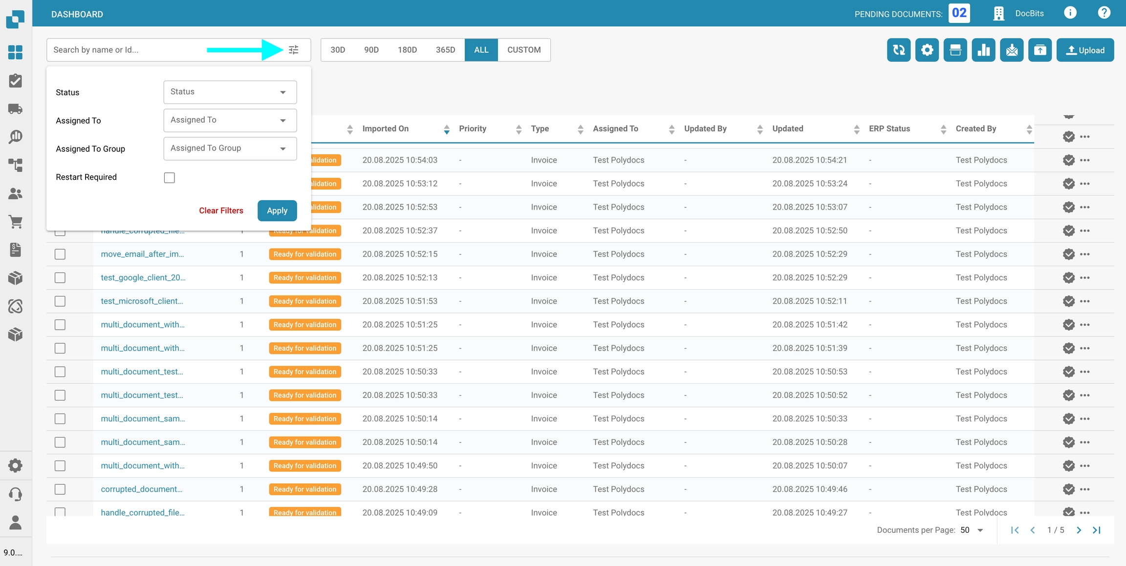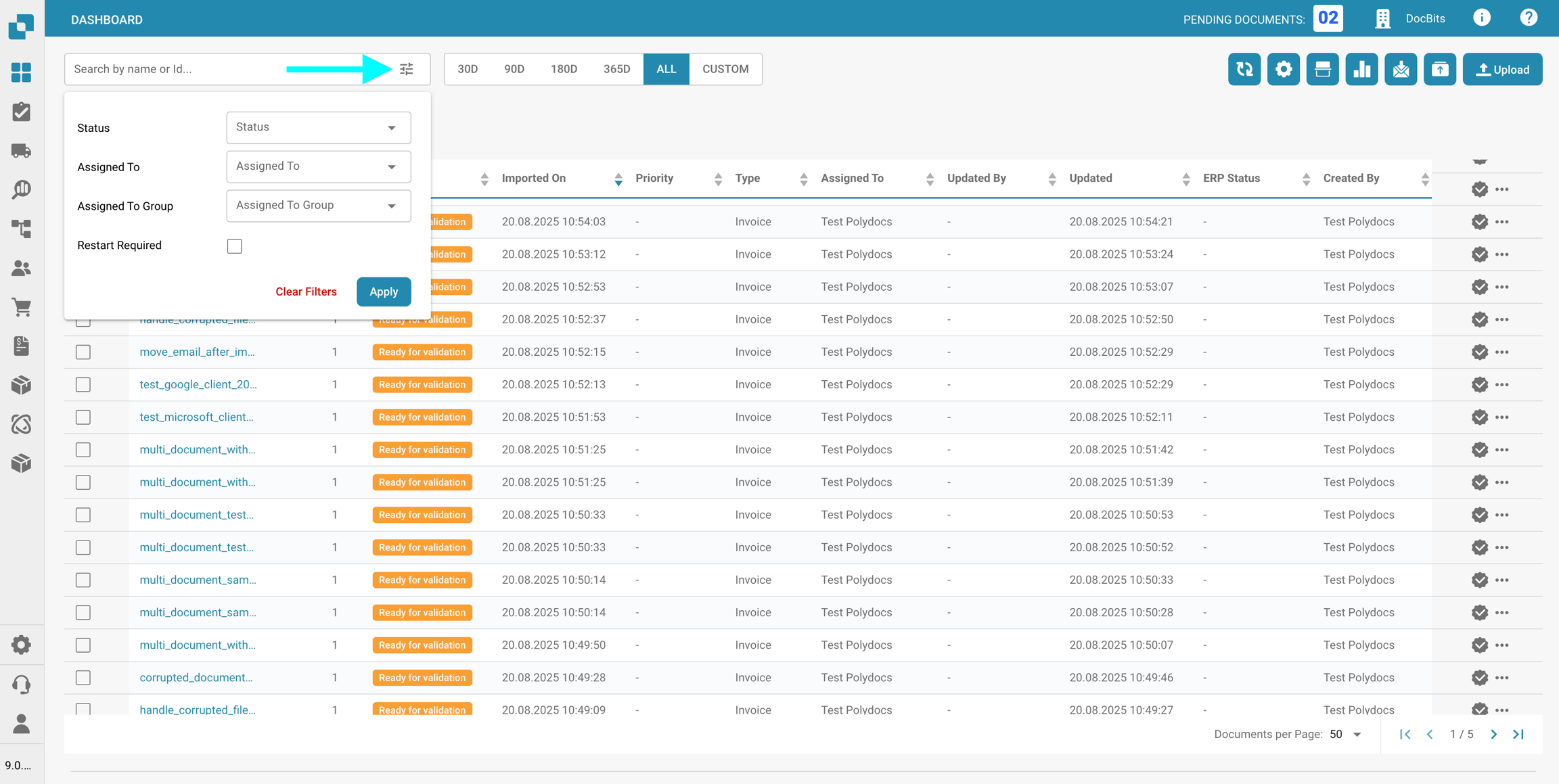 Status: Filtrowanie według statusu przetwarzania (np. Gotowe do walidacji, Odrzucone).