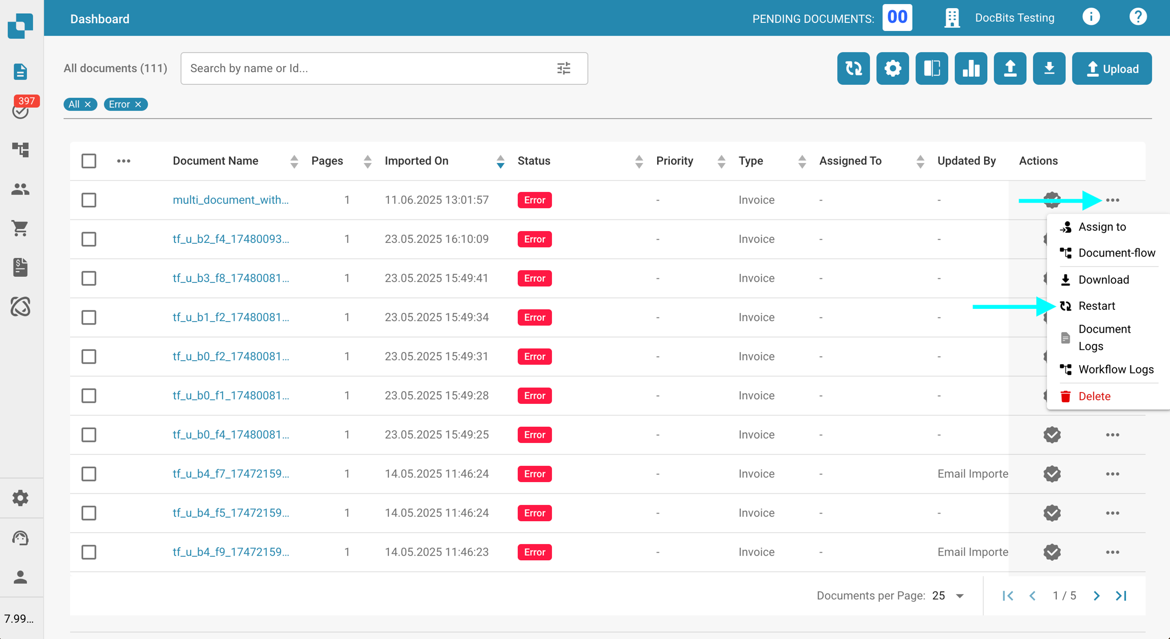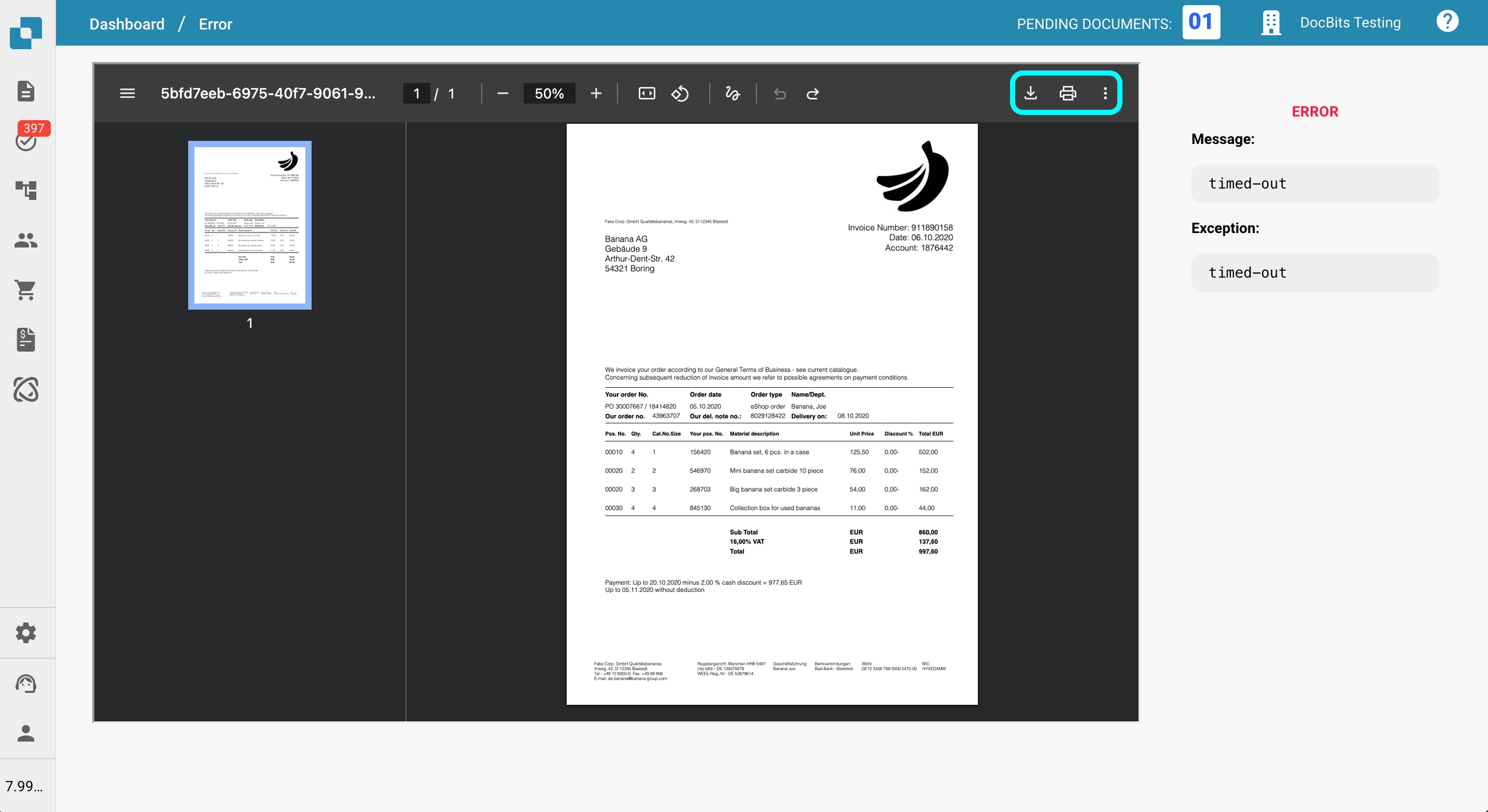 Jeśli wystąpi błąd podczas pracy z dokumentem, dokument przejdzie w status "Błąd". Kiedy to się stanie, możesz kliknąć na dokument, aby: