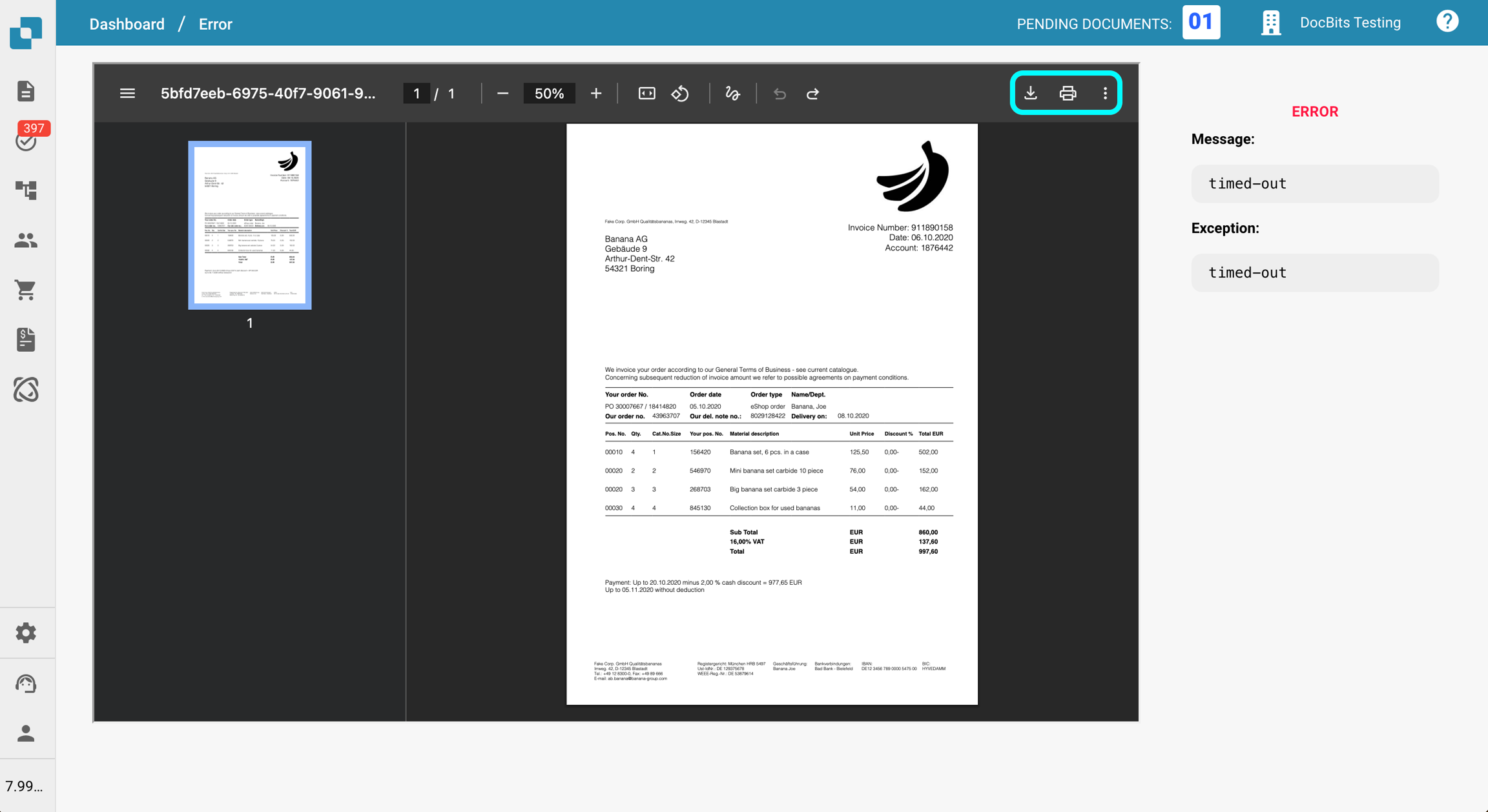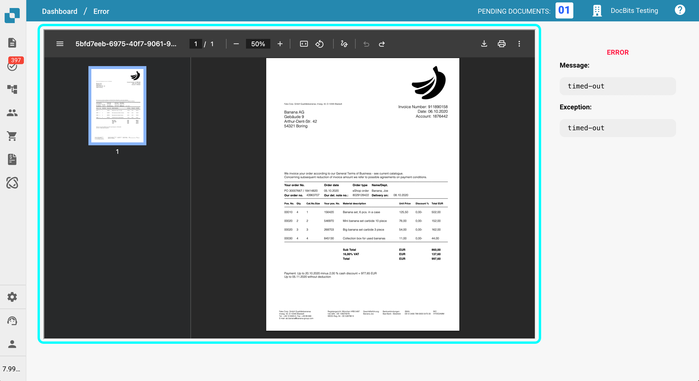 Po prawej stronie widoku dokumentu znajdziesz Wiadomość o Błędzie, która zawiera krótki opis tego, co poszło nie tak. Poniżej wiadomości o błędzie wyświetlana jest Exception, pokazująca, gdzie wystąpił błąd w kodzie. Informacje te są przydatne do rozwiązywania problemów i powinny być dołączone przy zgłaszaniu problemu do wsparcia.